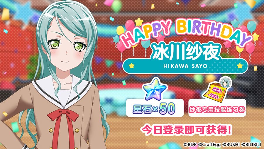 今日登录游戏可以分别观赏纱夜、日菜的生日庆祝动画,阅读后即可分别获得纱夜、日菜的特别礼物~