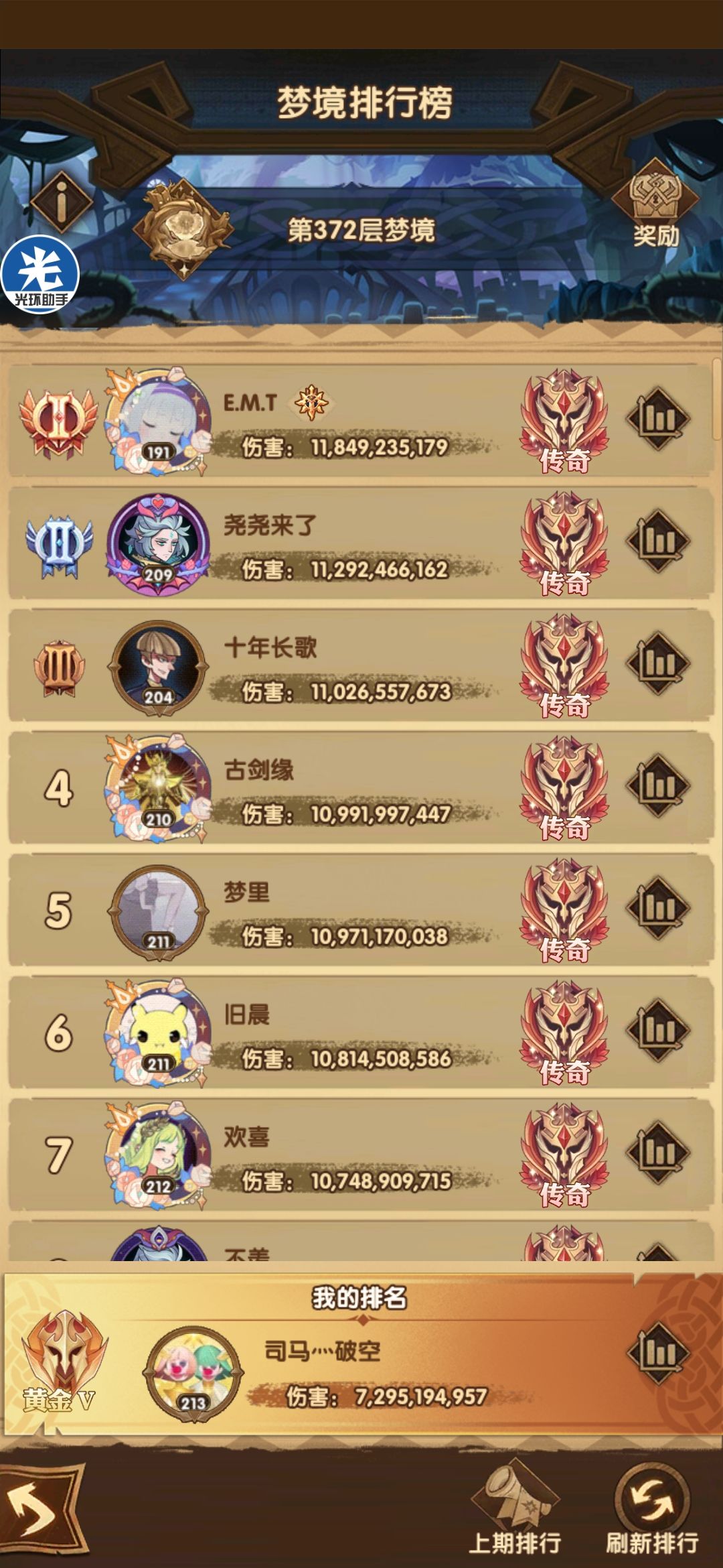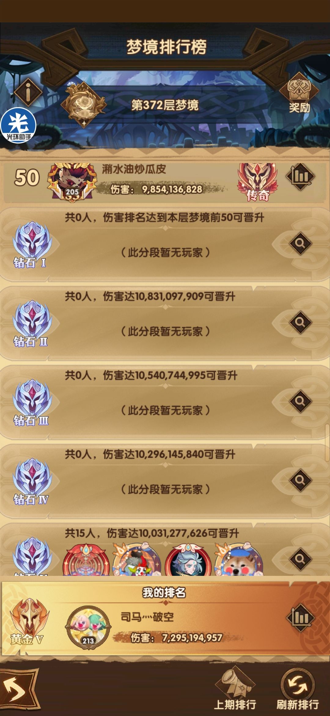 为什么我特么要来372受此苦难。艹 我记得在哪个帖子上看过 梦境排名是按照第五十名传奇伤害百分比来分的 钻一只需要达到传奇50的百分之多少。。 以此类推下去的。。 这尼玛传奇第六名连钻一的线都不配 (就意味着你能上传奇不是因为你达标了,而是因为你仅仅是前五十而已) 虽然我截图的时梦境才刚刚开始了一两个小时 ,但是372层的难度不是一天两天的了。 没有30蜥蜴or309禁卫 就只能在黄金4 5 如果你有了其中一个 再去借一个佣兵。那么也仅仅是钻五的门槛罢了。。。。就挺恶心人的 372-387 16级 堆积了多少玩家 连传奇第六都摸不到钻一线 你这条线是不是太高了? 珠穆朗玛峰都没你高![[嗒啦啦2_牛逼]](https://img.tapimg.com/market/images/db7cf8ec4c9f8ebacde83ec02c643b50.gif)