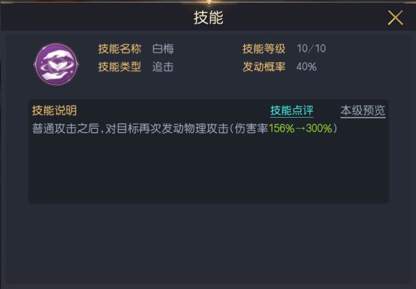 白梅属于追击型技能,技能的发动概率固定为40%,在触发时拥有300%高额单体伤害,虽然不具备其他的控制等效果,但亮点是此技能的伤害率随着技能等级的提升而明显升高,最终伤害率可媲美传说级技能,是前期开荒时的优质输出技能。