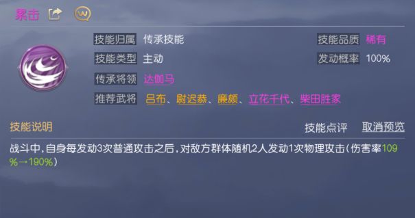 【累击】则能够使得立花千代在3次普通攻击之后对敌方群体2人发动1次物理攻击,可增加立花千代的输出能力。