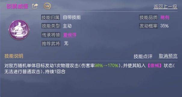 【啖睛威慑】拥有较好的伤害率,在触发后可使其陷入【缴械】状态,由于立花千代的速度在四星中属于较高水平,往往能够先手攻击使敌人陷入【缴械】,可限制敌方的普攻与追击技能触发。