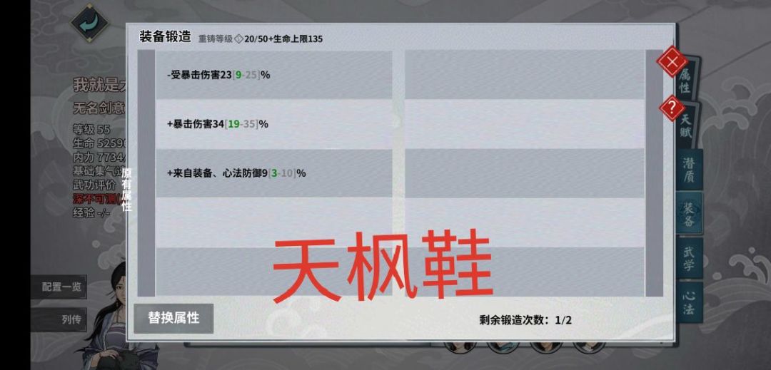 在解锁挑战本夜战洛阳之后,可以通过战胜天枫刀客后,会获得天枫木屐/天枫木屐碎片/天枫木屐宝箱,碎片可以在合成界面合成初始的天枫木屐,宝箱可以在背包中使用,天枫木屐2词也没有关系,可以通过装满琢磨,将木屐琢磨成天枫古屐,会+1词条:(尽量洗满)
