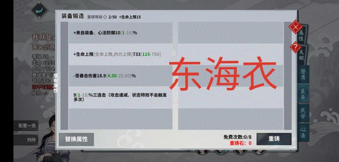 除了东海衣和门派武器,其他装备都可以通过高手挑战获得材料/直接获取,因此可以通过多次刷取/合成的方式,得到自带/使用自带洗炼次数获得,高臂力的卢生剑带和伍子胥配饰,再利用锻造次数洗炼出其他词条,可以有效的节省洗炼次数。(在升级阶段配合永动机刷取改更香哦)