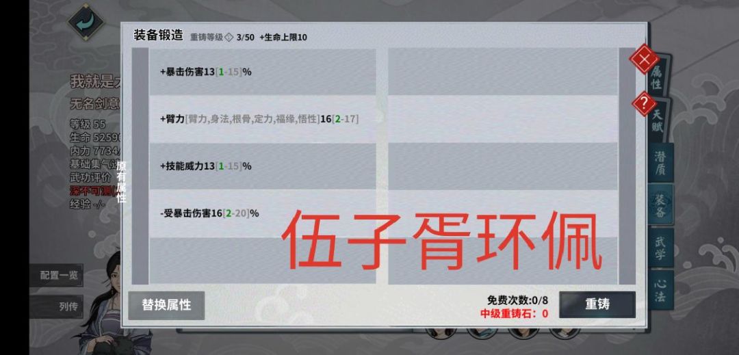 33级高手挑战解锁伍子胥,做出伍子胥头和伍子胥配饰,洗炼方案如下:(未洗满,尽量洗好)