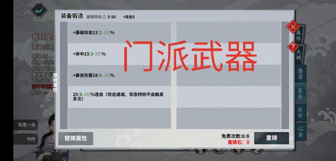武器选门派刀:因为门派刀可以洗25%的连击概率,并且稀有磁条也是提供连击概率的,是针对第二个boss徐夫人所需要的