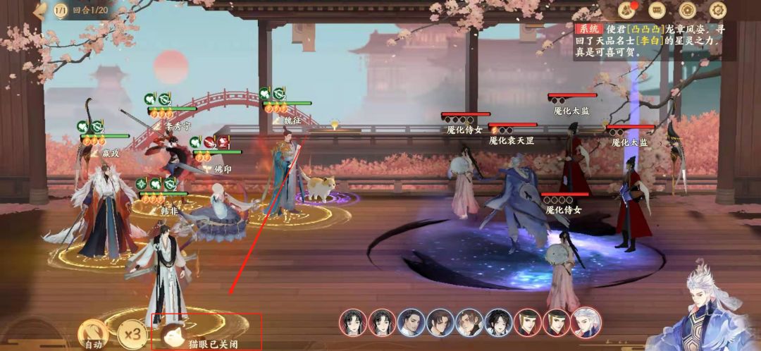 3、抓猫的流程:首先猫猫在日常战斗中很难碰到,如果碰到了,抓的步骤如下:开猫眼、把猫打残、点击抓猫