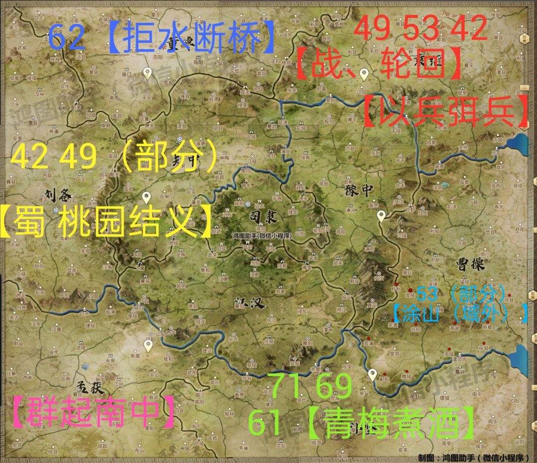 与前两个赛季不同,S3赛季六大势力平分天下,49,53,42区落袁绍、曹操;61,69,71区落孙坚、孟获;62落董卓。