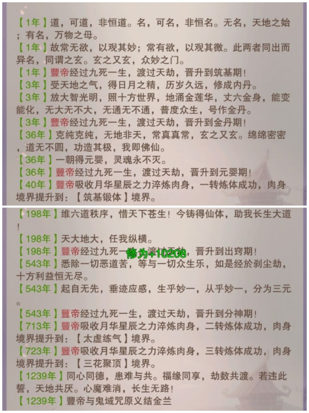 到分神前的进度在下图,出窍后我就没有断过练功房,大概就是3年金丹,36年元婴,198年出窍,530年分神,1300年合体(氪了3本9星秘籍)