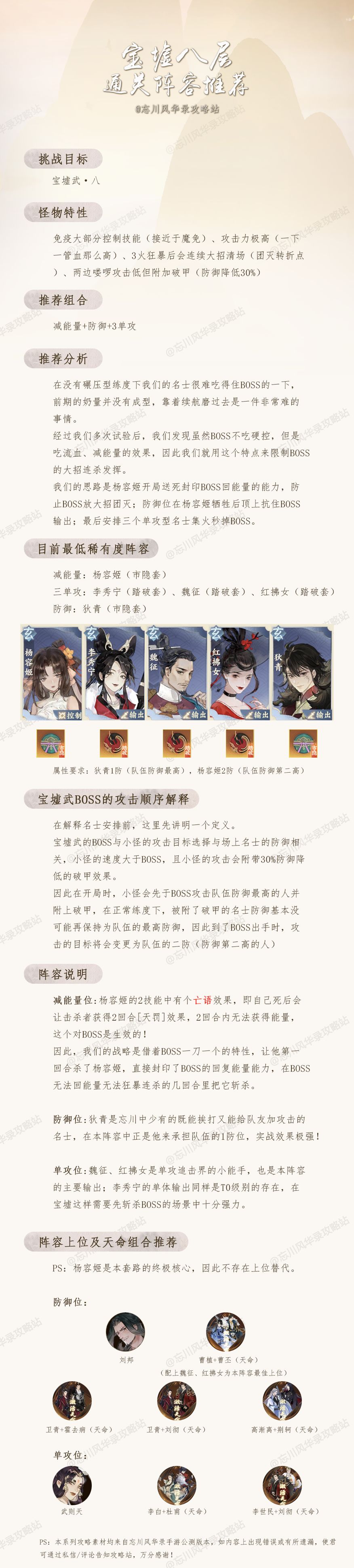 杨容姬的“天罚”是目前看来对宝墟系列BOSS较为有效的压制手段,由于战斗期间小怪叠“破甲”的概率有些波动,所以战斗稳定性有些难以预测,因此仅作为一个思路供大家参考,希望可以可以帮助到各位使君。