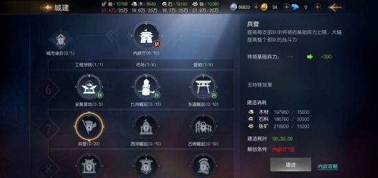 四大资源建筑等级分别在7级,采石场14级左右,其他建筑跟随历程即可。然后是野地选择,在游戏中无论是历程需要还是升级需要,我们都必须将领地上限打满,建议石料、粮食、木材、铁矿四大资源地的比例为5:1:2:2,配合资源建筑,石料的产出必须为其他资源的两倍。其次是通过试炼也可获得大量资源,能显著减少等待资源产出的时间,千万不要忘了刷。