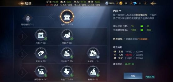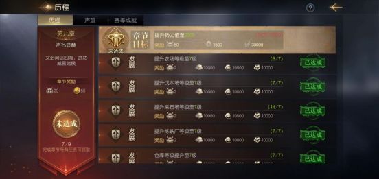 当我们了解7本的重要性后,要面对的问题就只有如何最快达到7本,首先是7本资源消耗为10W木材、铁矿、20W石料,要达到这个数字仓库至少要在6级,所以建议大家在升级7本以前都不要随意升级城建,直接跟随历程任务做至第九章,在此之前所有的城建的投入都少于历程奖励,相当于白给的资源。