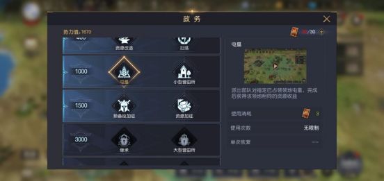 屯垦是快速升本的重点,前期基本无政令消耗,建议大家只用在犒赏三军、屯垦、预备役加征、资源加征这几项,成功开5级地后再使用屯垦。