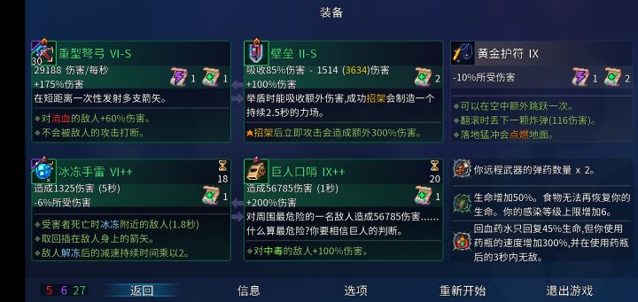 新手推荐,绿流重弩,伤害高,能控制,技能就比较随意了,绿色基本都可以。变异的话点绿流回血,食物增加100%回血,后期回血快容错率极高,半血的话十几个小怪就能回满。以下是我打王手换了变异。