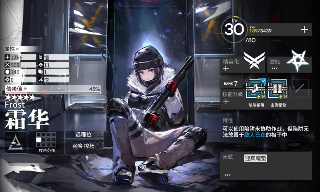 面板数据:五星特种干员,霜华。她的特性描述是“可以使用陷阱来协助作战,但陷阱无法放置于敌人已在的格子中”,这是继罗宾之后,第二位“陷阱系特种”子职业的干员,陷阱才是她们真正的本体。