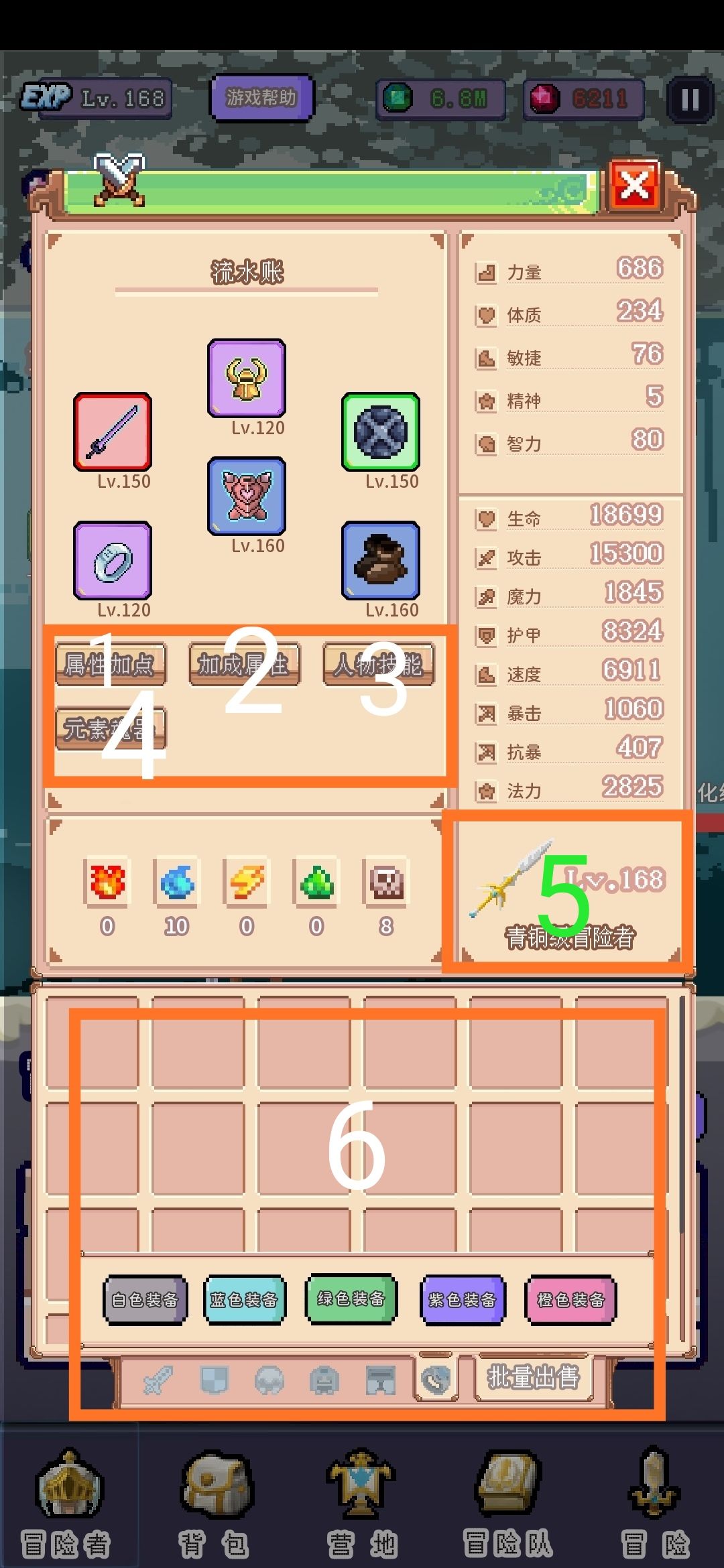 6是装备背包,跟物品背包分开,每个种类的装备单独存放,下面从左到右分别是武器,副手,头盔,护甲,鞋子,饰品,出售