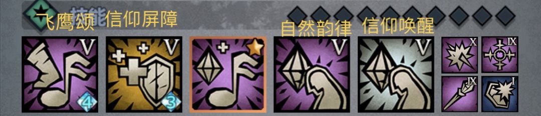 被动主动技能:自然韵律(大德,加AP上限及回蓝)或精准鼓舞(长弓或弩手,回蓝不如自然韵律)