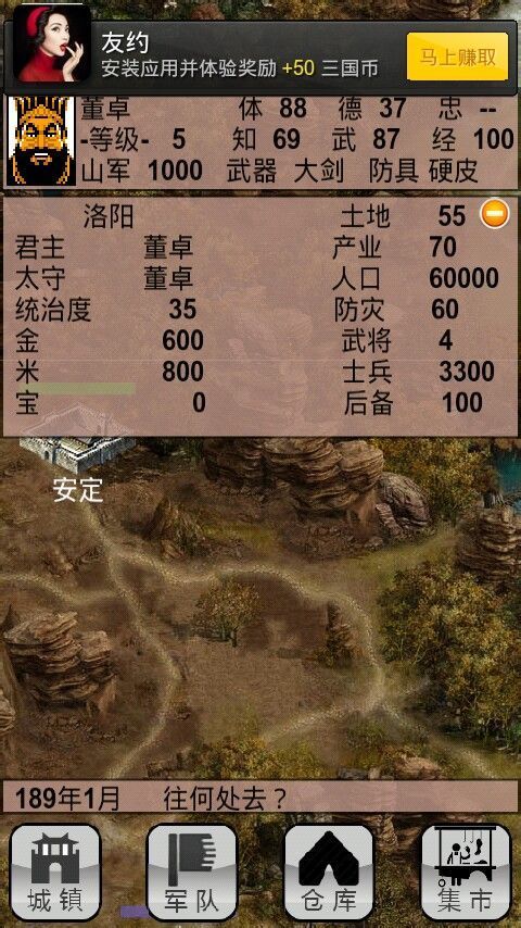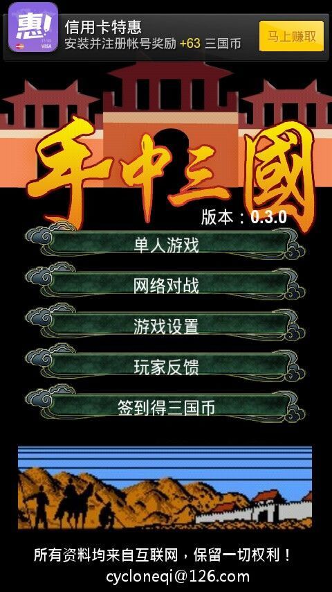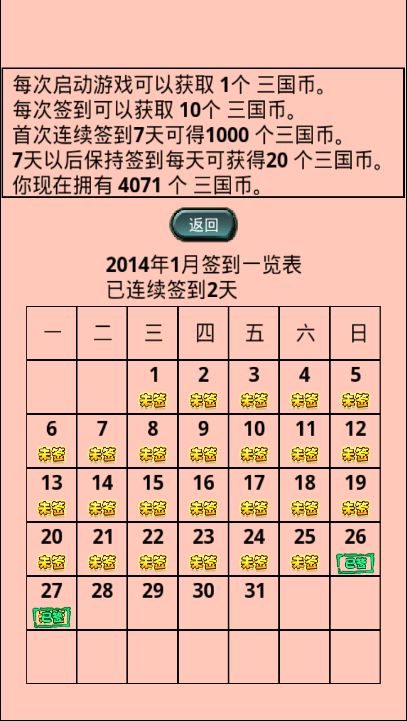 4.新增签到功能,可以赚取积分。每次签到可获取10个三国币。每次进入游戏(新游戏或者读取存档)可获取1个三国币。