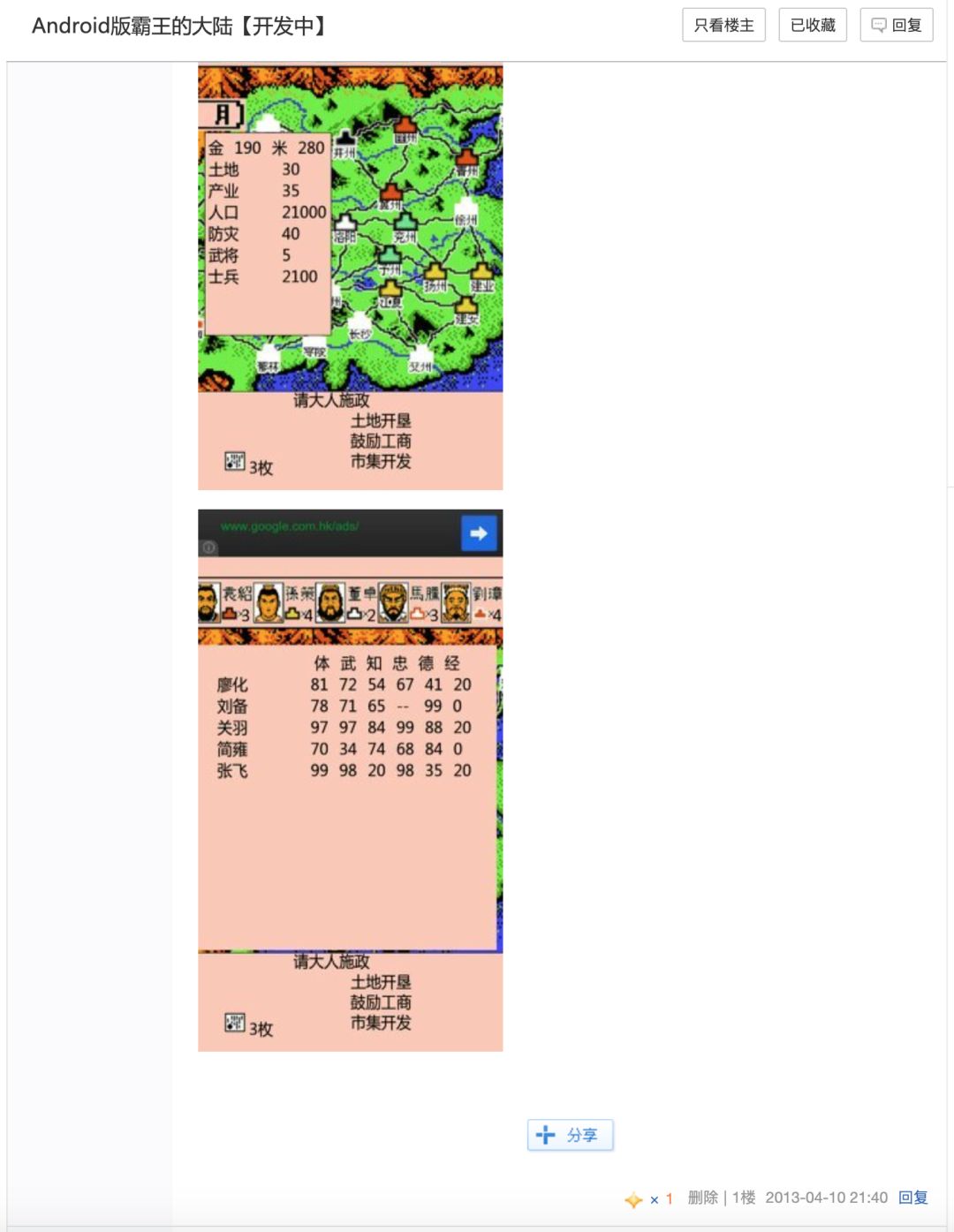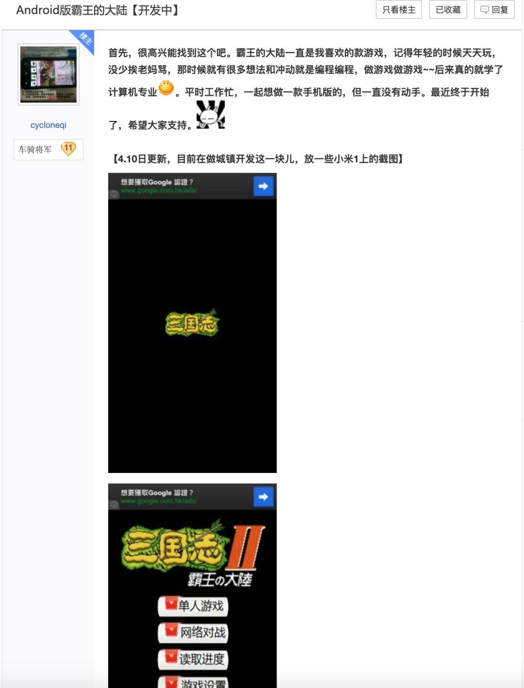 2013年4月10日,首次在『霸王的大陆』贴吧公布自己做安卓版本的消息,原贴地址在这里。下面是截图。