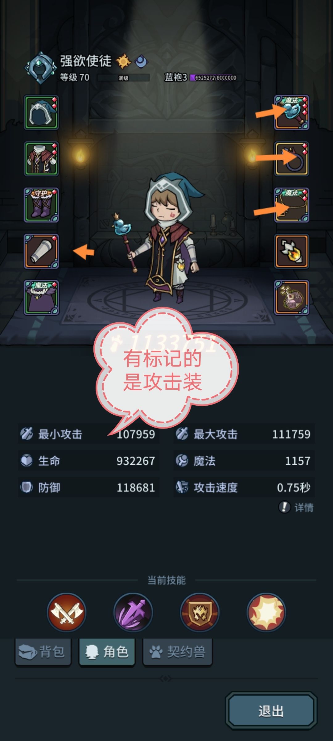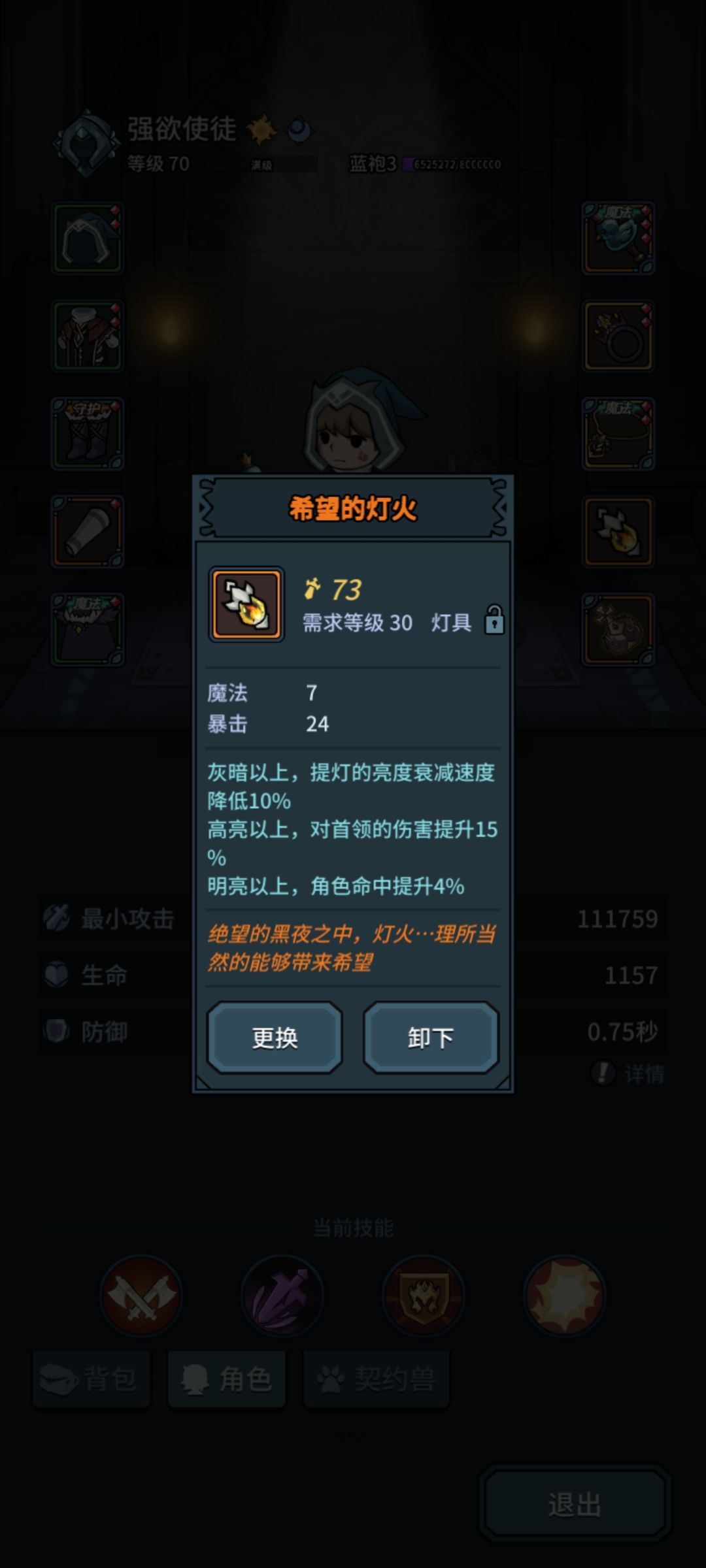 全身装备分攻击装和防御装各4件,还有一个灯和一个圣物,如图