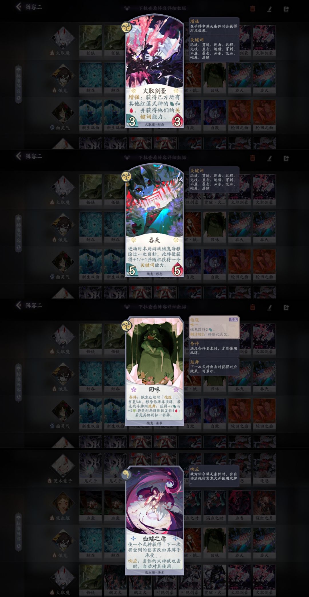 中期做好场面交换,利用吸血姬吸血词条配和火取剑豪保血撑回合,饿鬼能吃就吃,后期吞天是一张可以打一个卡组的单卡。