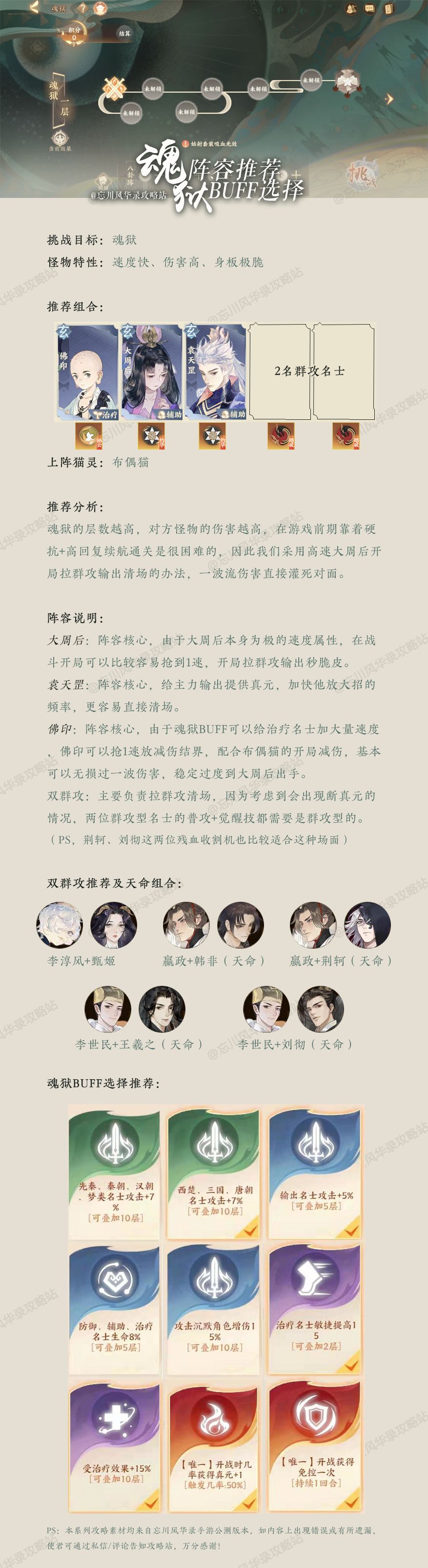 魂狱通关的主要思路是速攻,靠袁天罡+大周后的组合让输出持续先手秒了对方,大家可以参考一下这个思路!