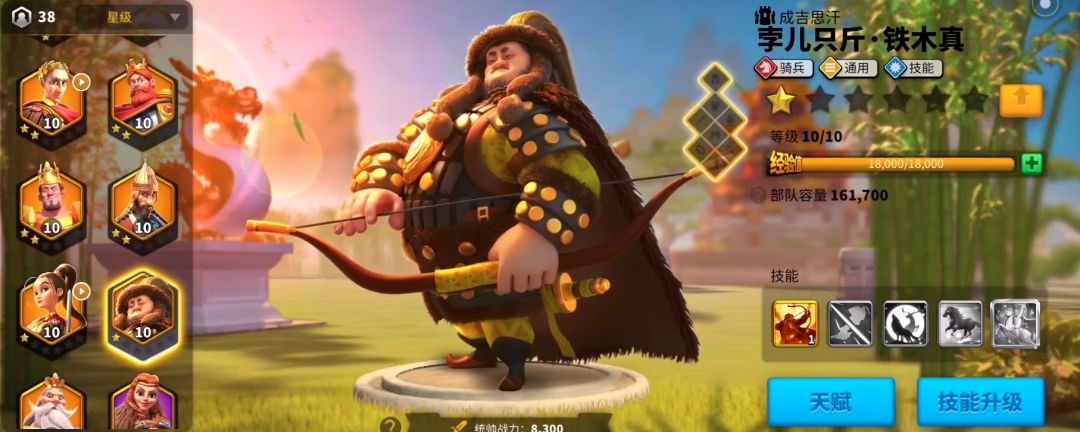 铁木真是传说品质的将领,其天赋配置是骑兵、通用和技能,基本的将领定位是游击、野战和集结。
