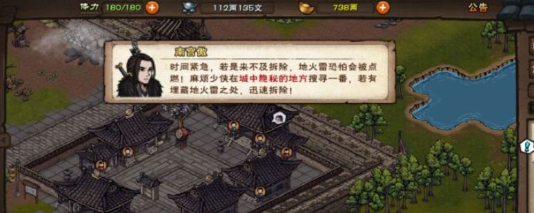 《烟雨江湖》中想要完成“幽城兹事”就需要在完成幽城支线任务的过程中拆除幽州场景中存在的五颗地火雷,其中每个地火雷分布的位置各不相同,大致分布在幽州场景中的北边、中间、西边、东边、以及南边,只需要找到并拆除它们即可。