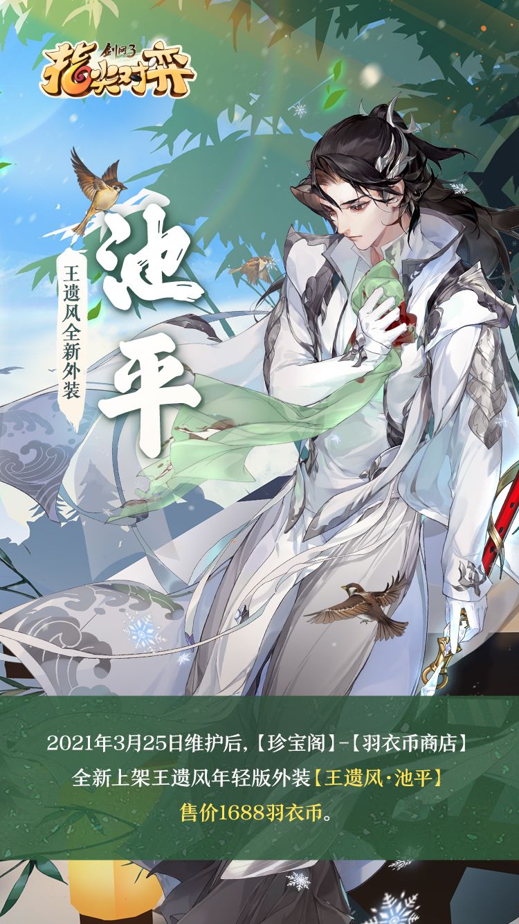 3月25日维护后,【珍宝阁】-【羽衣币商店】全新上架两款年轻版外装【王遗风·池平】、【谢渊·凭栏】!