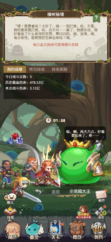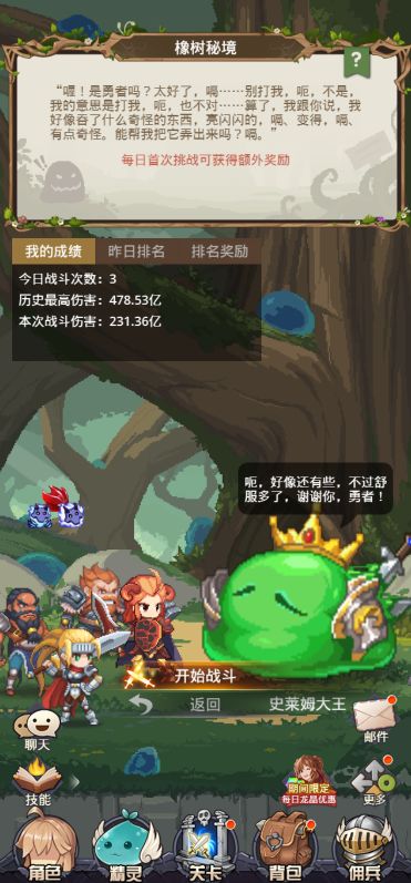 内容介绍:在限定时间内攻击史莱姆大王,统计伤害数值,并根据全服伤害贡献排行,在第二天收取对应的名次奖励,获得体格强化必要的养成消耗道具【秘境精华】;每日首次挑战会获得额外奖励。