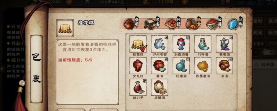 烟雨江湖的桂花糕是游戏中的很多女性NPC喜欢的糕点,直接进行食用可以恢复角色的3点体力,桂花糕的配方任务在龙泉镇的农屋处触发,触发后只要一直跟着鹊大夫救助病人就可以获得桂花糕的烹饪配方,制作出想要的桂花糕点心。
