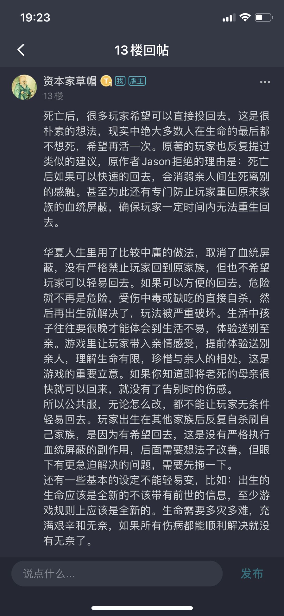 就目前游戏而言,本来投个胎被人养就很难,然后好不容易有人养了,而且玩的很开心,想着再投回去,然而有禁令限制你再次投回去,这样不好吧。