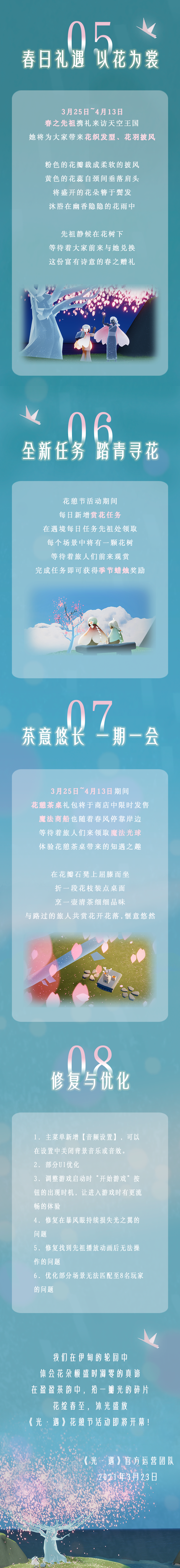 《光·遇》花憩节即将拉开序幕,我们将在3月25日 01:00-10:00进行版本更新,预计更新时间为9小时。更新中无法正常游戏,敬请谅解。如果在预计时间内无法完成更新内容,开服时间将顺延。