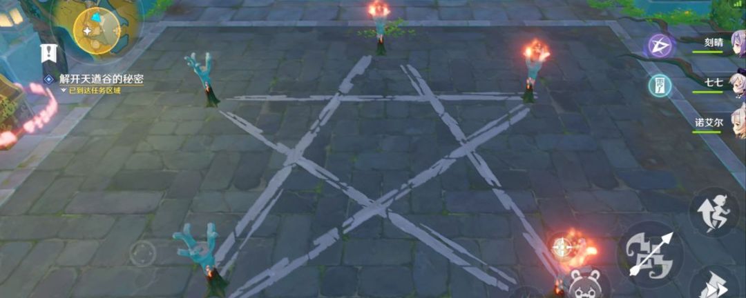 天遒谷火柱子一共有三层,其中第二层地上有一个五角星的法阵,五个角上各有一个火柱子,这也是最难的一层。需要让3个火柱子形成一个三角形才能通关,每个火柱会影响与之相连的另外两个火柱子,除非在最后一点点燃,不然3个相连的火柱子只能同时点亮一个。如果无法摸清规律的话,很有可能会点燃两个柱子后再点第三个,之前的一个就会熄灭。