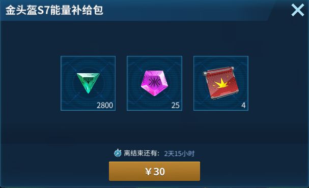 金头盔S7能量补给包(30RMB):[能量水晶颗粒]*2800,[能量水晶]*25,[低级伤害卡]*4