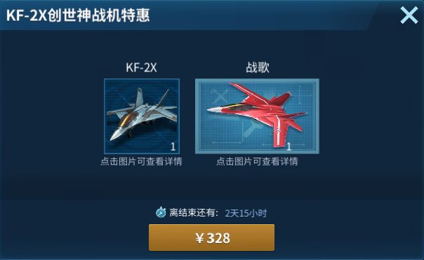 KF-2X创世神战机礼包(648RMB): [钻石]*3600,[金币]*200000,[KF-2X战机]*1,[KF-2X战机涂装]*1