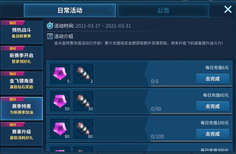 金头盔特惠充值活动已开启!每日充值指定金额获取额外水晶奖励,用来升级飞机装备提升战斗力!
