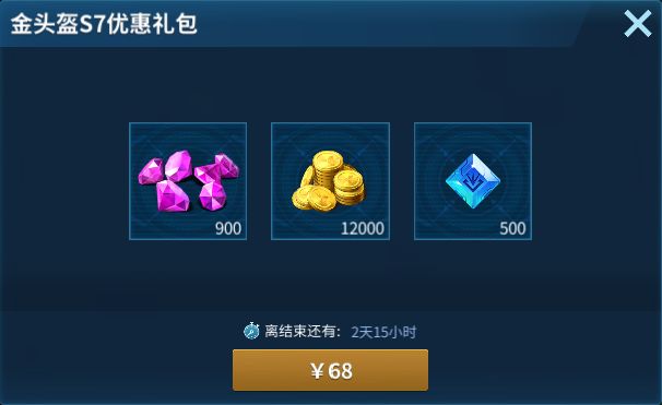 金头盔S7优惠礼包(68RMB):[钻石]*900,[金币]*12000,[能量水晶碎片]*500