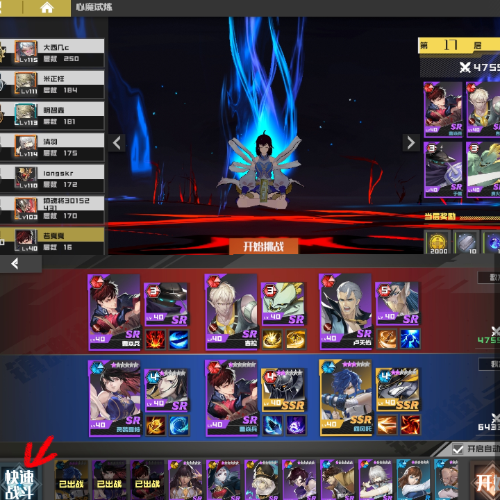 挑战布阵中布置好寄灵人和守护灵好后 点击左下角快速战斗(战斗值没对面高可放弃下次一定)