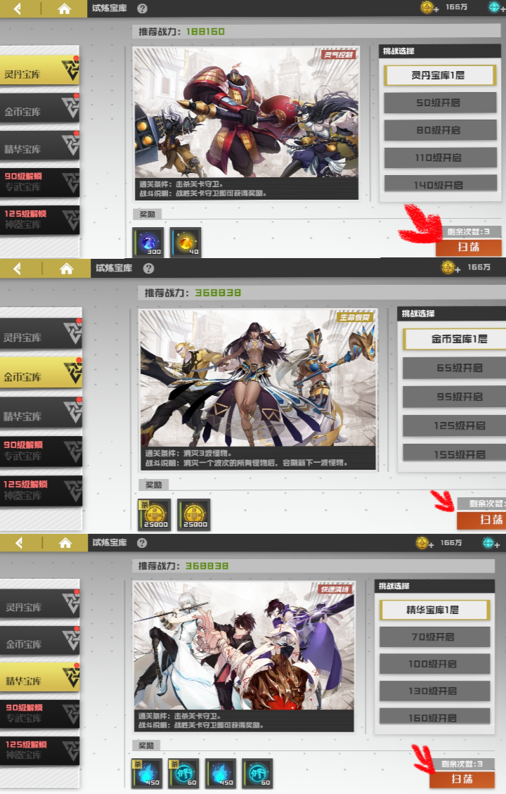 在试炼宝库里每天可以扫荡根据等级解锁奖励等级越高奖励越丰富