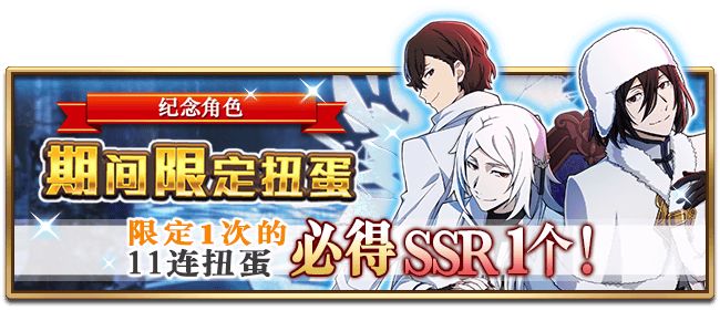 活动时间:3月24日16:00~3月31日12:59(8天) 纪念角色序章降临,赶快行动起来吧! ①期间限定扭蛋:SSR【骸砦的恶魔】费奥多尔.D且限定1次11连扭蛋必得SSR一个! ②阶段上升扭蛋:到达第四阶段必得SSR角色*1,到达第七阶段可获得[特别兑换券]*1,到达第八阶段SSR出现率高达2倍且不限次数! Ps特别兑换券可兑换:SSR【骸砦的恶魔】费奥多尔.D、SSR【锐利目光】福泽谕吉、SSR【独步吟客·人间失格】国木田独步、SSR【异能冲击】太宰治(附语音)、SSR【月下兽·人间失格】中岛敦、SSR【重力操控】中原中也(附语音)