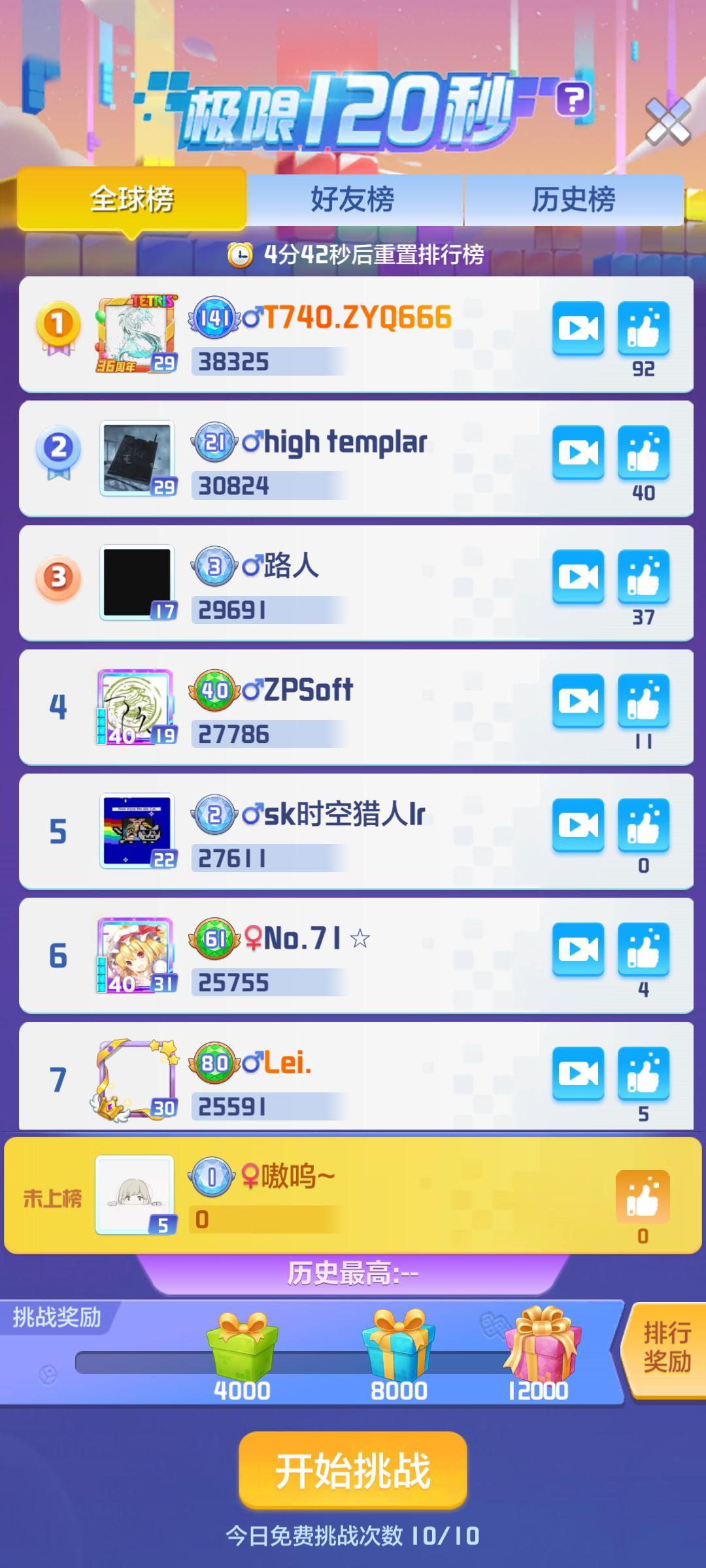 极限120秒挑战会不会让各位高手心跳加速呢?想必能进入排行榜的方块玩家一定有很强的心理素质吧!本周手Q“T740.ZYQ666”以积分38325位居榜首,“high templar”以积分30824位居第二,“路人”以积分29691位居第三。三位高手成功进入极限120秒前三名,与后续方块玩家距离可不远哦,想要稳住排名,可不能松懈呀!