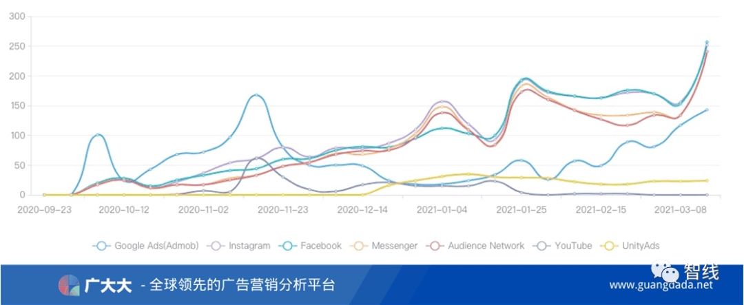 产品当时的投放量级并不大,保持在日均140条左右,初期主要以Google Ads渠道为主要买量阵地。第一波投放高峰持续现在21年元旦附近,峰值日素材超过550条,主要集中在Instagram、Messenger等FB系渠道。