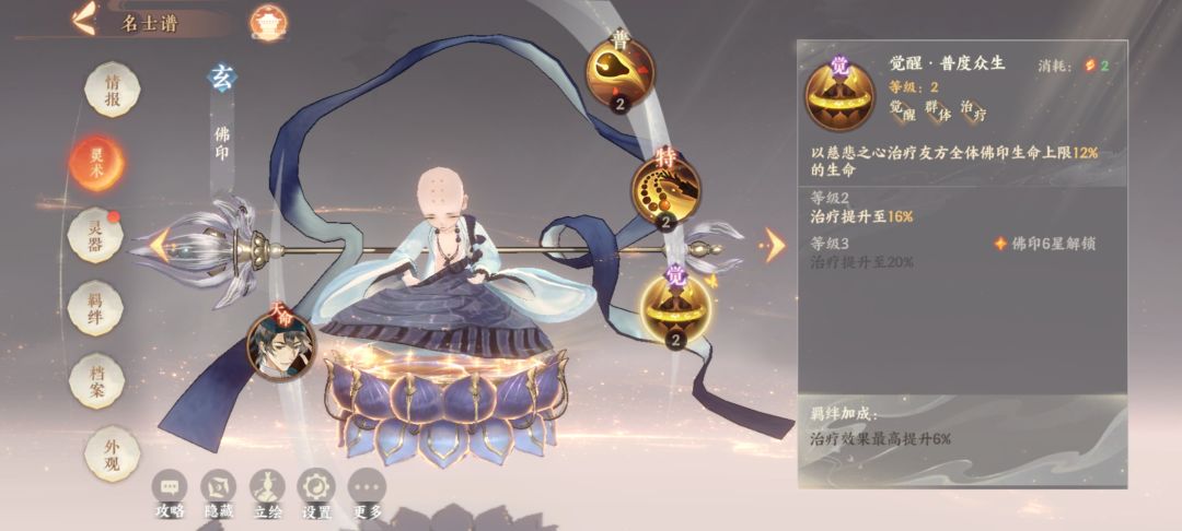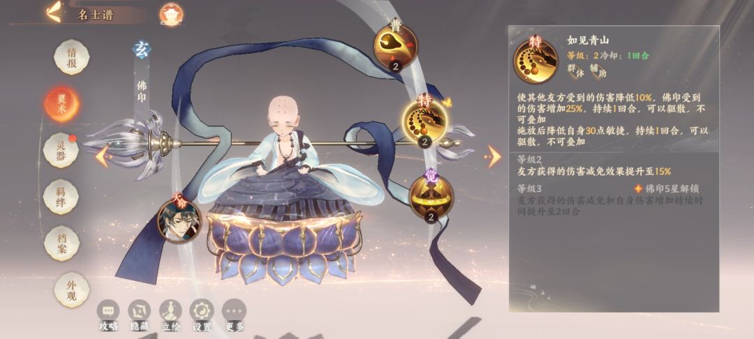 我们的小和尚佛印可以提供较为可观的减伤效果且附带治疗作用,可以说是比较全面的一个奶爸了,我们的佛印又是比较好获得碎片的角色培养也是比较轻松的