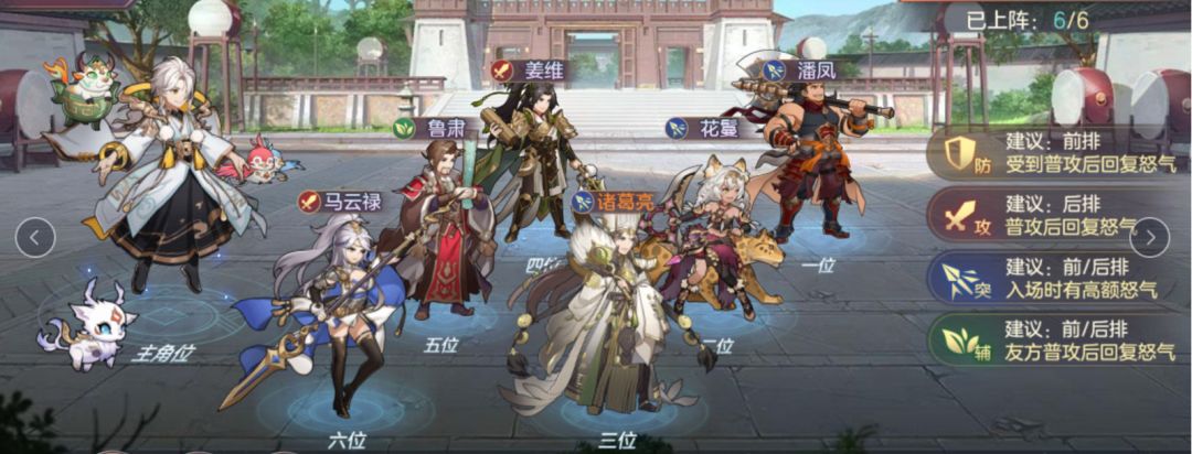 推荐组合为潘凤、马云禄、姜维、花鬘、鲁肃、诸葛亮。阵容成型之前,可以用更易获取的邢道荣配合潘凤组成的“二傻”组合当输出位过度代替其他星级不够的c位,张星彩、关银屏作为输出位备选;辅助奶妈位可以用前期白送的蔡文姬过渡,甄姬、步练师亦是不错的过渡辅助位(用步练师过渡,可以再上一个孙权)。三星鲁肃、五星诸葛亮、三星马云禄、三星姜维,可以上场,不然强度不够,建议保留原先过渡阵容。成型阵容和过渡阵容站位如下: