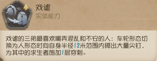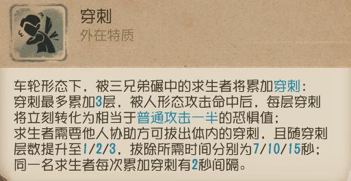 ② 在开启二阶技能后,可以先用轮形态碾中求生者,之后立即切换人形态。【戏谑】会为附近求生者施加1层穿刺,这样能快速累加2层穿刺,再使用普攻将其击倒。