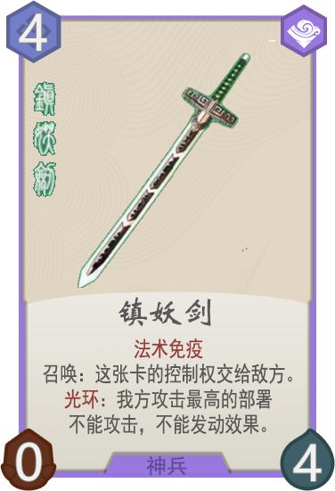 卡名:【镇妖剑】(照胆神剑):原本是神界将军飞蓬的佩剑,因在新仙界与重楼战败而流落人间。镇妖剑具有震慑妖魔的神力,被蜀山仙剑派奉为镇派之宝。