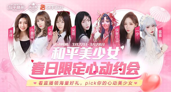 连续七天,比心相见!快手和平精英特别活动“和平美少女春日心动约会”即将上演,七位游戏美少女主播轮番惊喜降临!