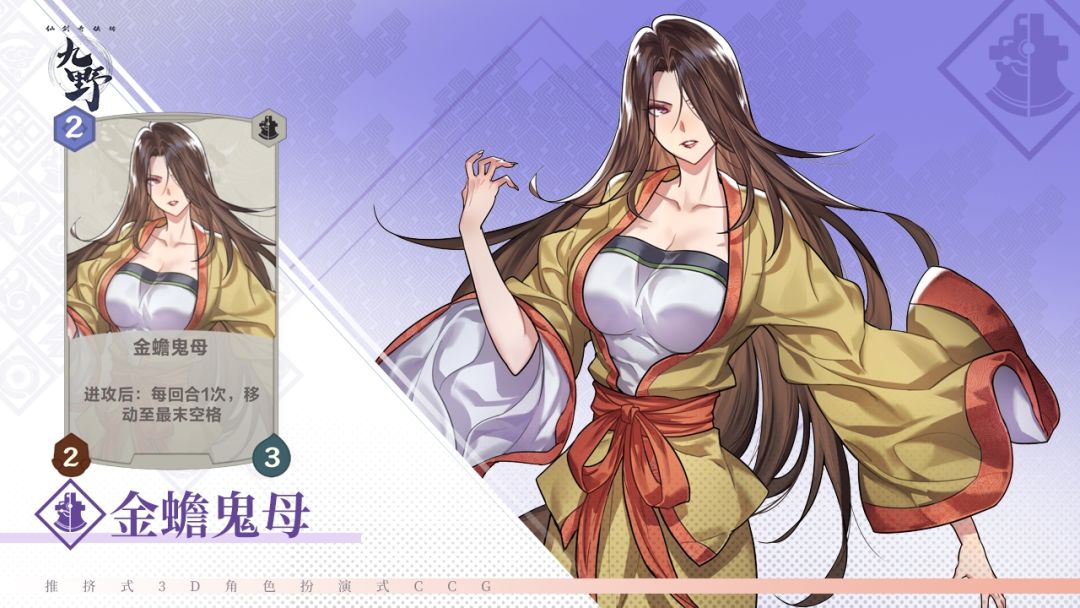 金蟾鬼母本名柳媚娘,本是绝世美女,因修炼毒功半边容貌尽毁被负心人抛弃,亲手复仇后,与毒物蛤蟆精为伍,但从此不再相信任何男人,且仇视一切负心汉,后因被逍遥和月如看见容貌,恼羞成怒想除去二人,但技不如人,反被李、林二人所杀。鬼母卡牌效果参考金蟾特性,进攻后可进行跳格,每回合一次,默认跳到最末空格。