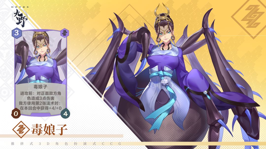 是她是她就是她,就是她毒害刘晋元害得彩依不得不用千年道行换晋元一命。毒娘子修行年数本来只有五百年,意外获得了雷灵珠后想捕食千年蝶精彩依增加功力,却被刘晋元破坏,故对晋元下毒,迫得彩依为救晋元而牺牲;毒娘子的卡牌效果也参照了她的剧情,本来是无攻击的,靠外在因素获得4点攻击后,还可在进攻前对正面敌方造成3点伤害,不愧为毒娘子啊,果然够毒。