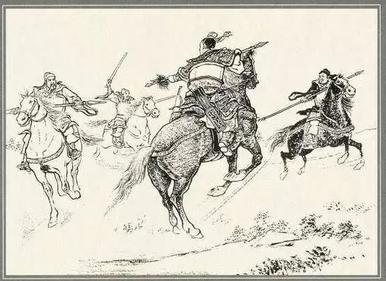 8. 刘备“掣双股剑,骤黄鬃马”加入战团,三兄弟围住吕布“转灯儿般厮杀”,吕布独对三将,“三人围绕战多时”,吕布“招架遮拦不定”,从包围圈中最弱的一环――刘备这个方向突破,冲出了包围圈。